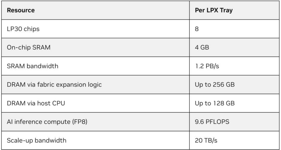 El acelerador a escala de bastidor LPX alberga 32 bandejas de computación de 1U refrigeradas por líquido, cada una diseñada para admitir la inferencia de baja latencia a escala. Cada bandeja integra ocho aceleradores de LPU, un procesador host y la lógica de expansión de estructura en un diseño sin cables que simplifica la implementación a escala de bastidor y acopla estrechamente la computación con la comunicación.