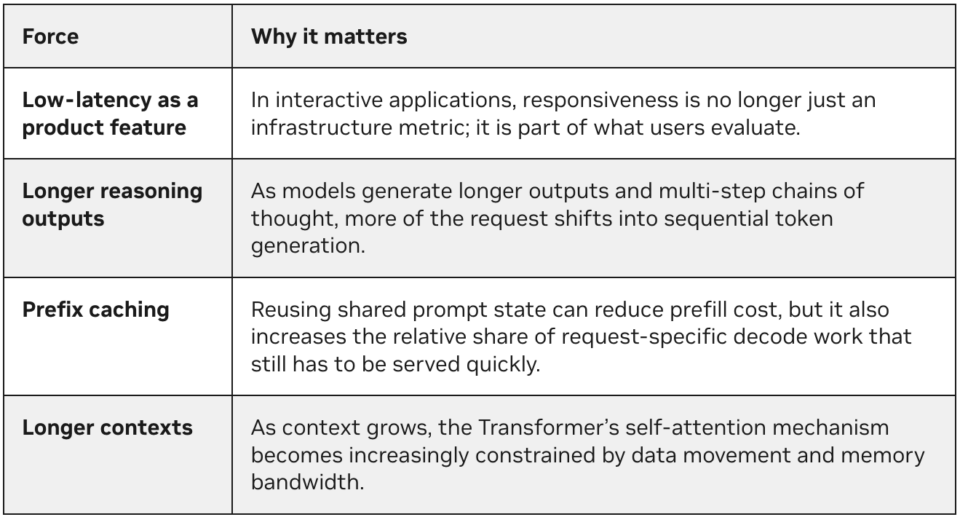 Al mismo tiempo, los contextos más largos aumentan la presión sobre el ancho de banda de memoria y el movimiento de datos, mientras que el servicio a muchos usuarios simultáneos reduce la eficiencia de procesamiento por lotes de la que dependen los sistemas orientados al rendimiento. Como resultado, los sistemas optimizados para el máximo rendimiento agregado no siempre son la mejor opción para las cargas de trabajo que requieren una generación de tokens rápida y predecible para cada solicitud.