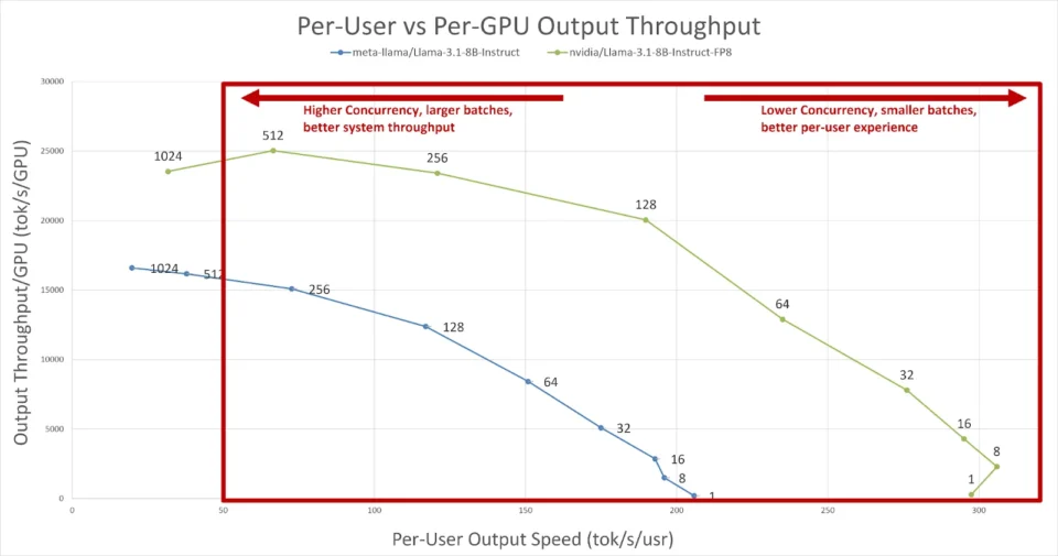 Esta opción es útil para producir varias curvas diferentes, que son cruciales al buscar objetivos de latencia y rendimiento. Aquí hay un conjunto de curvas basadas en Llama-3.1 8B FP8 de NVIDIA y Llama-3.1 8B FP16 de Meta generadas para un escenario 128/128 ISL/OSL. Digamos que queremos utilizar el sistema tanto como sea posible, pero aún queremos que un usuario experimente alrededor de 50 tokens/segundo de velocidad de salida (aproximadamente 20 ms entre tokens). Para evaluar la compensación entre el rendimiento de la GPU y la experiencia del usuario, puede trazar el rendimiento de salida por GPU frente a la velocidad de salida por usuario.