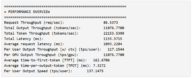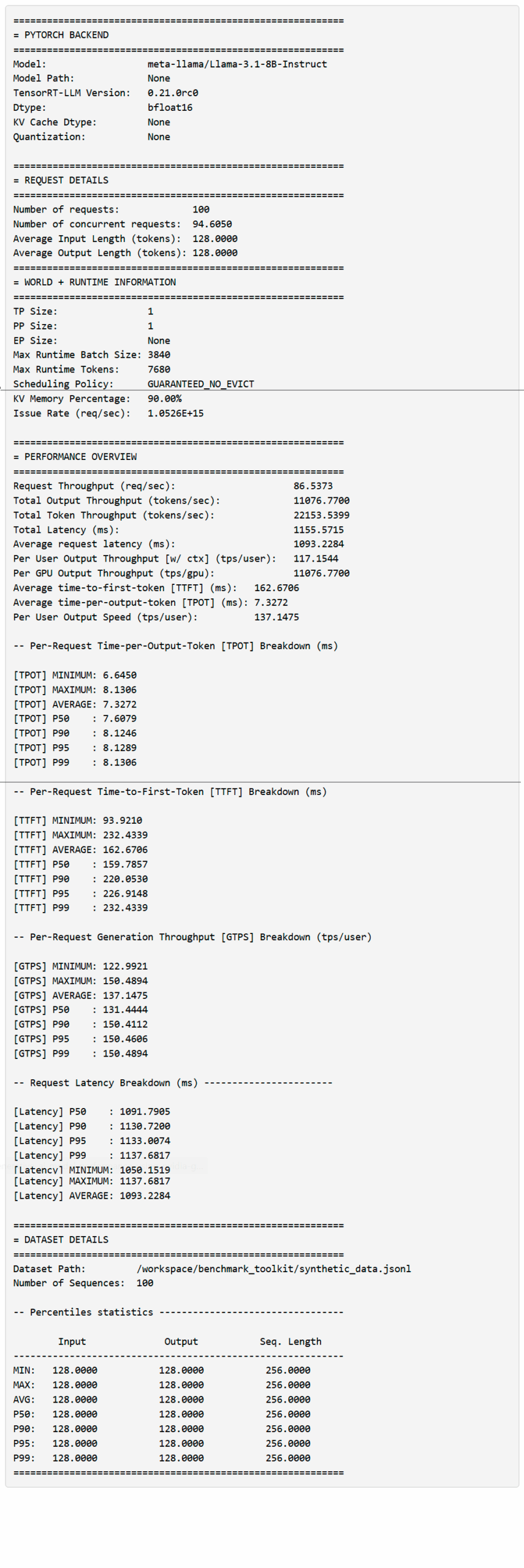 El comando de rendimiento extraerá automáticamente el punto de control de HuggingFace (si no se almacena en caché) y arrancará TRT-LLM con el flujo de PyTorch. Los resultados se guardarán en results.json e imprimirán en el terminal de la siguiente manera una vez que se complete la ejecución: